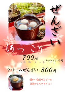 温かい白玉ぜんざいに抹茶かミルクアイス!